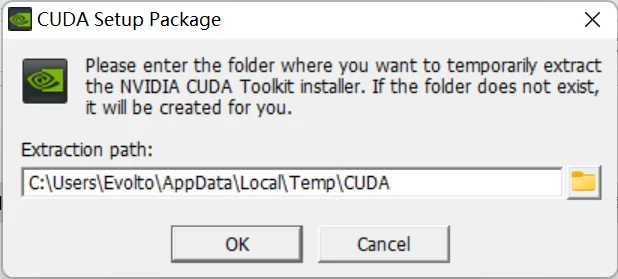 与普通软件安装不同,在安装 CUDA 时,需要设置两次。第一次要求设置临时解压目录,第二次才是设置安装目录,这里建议默认即可,也可以自定义。安装结束后,临时解压文件夹会自动删除。切记,使用两次设置的路径不能相同,否则安装后会找不到目录。同时,因为是系统级软件,所以最好全程使用默认的安装位置。