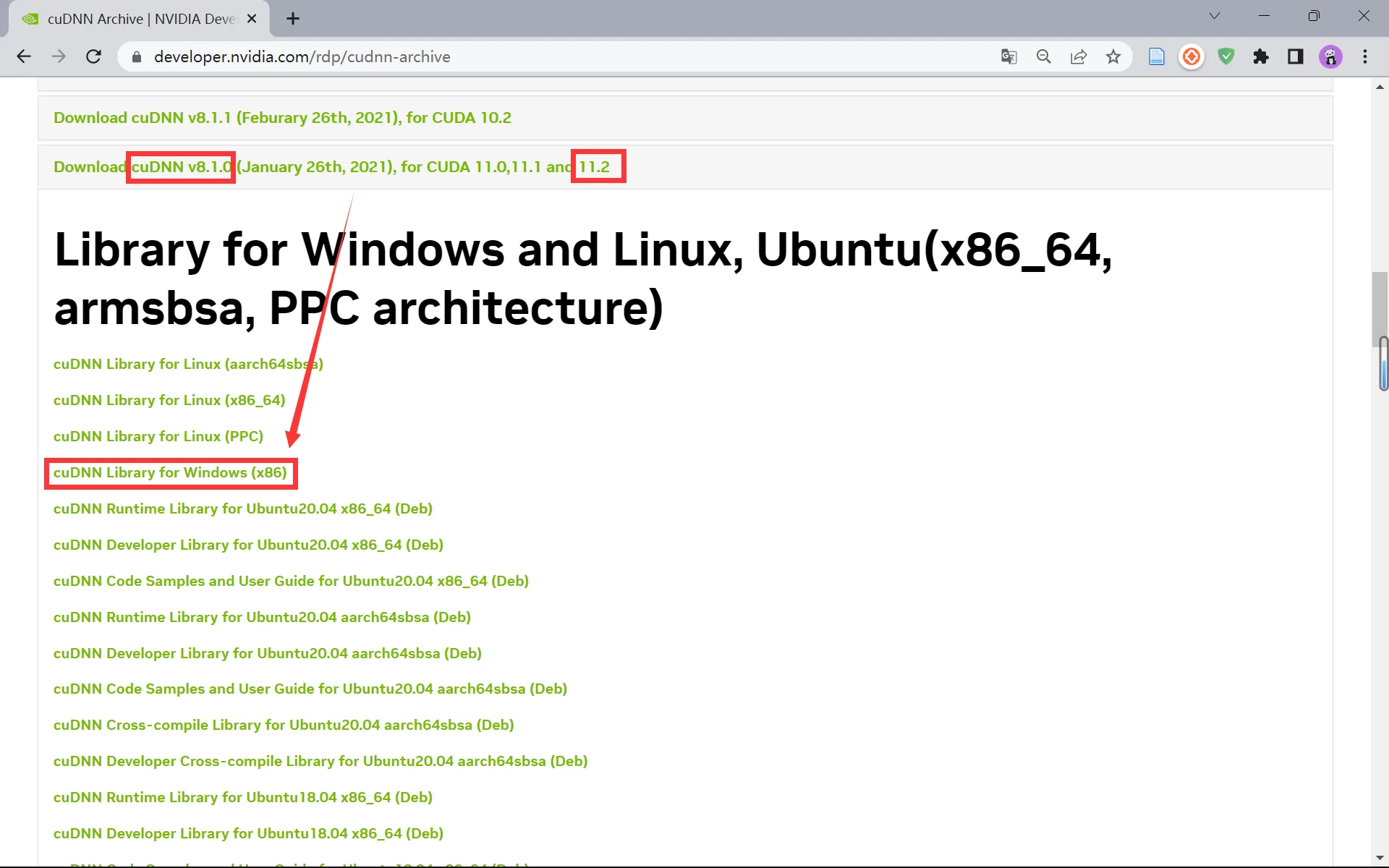 cuDNN下载,因为之前安装的 CUDA 版本号为 11.2,所以我们选择对应版本的 cuDNN 进行下载。