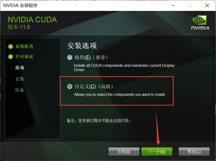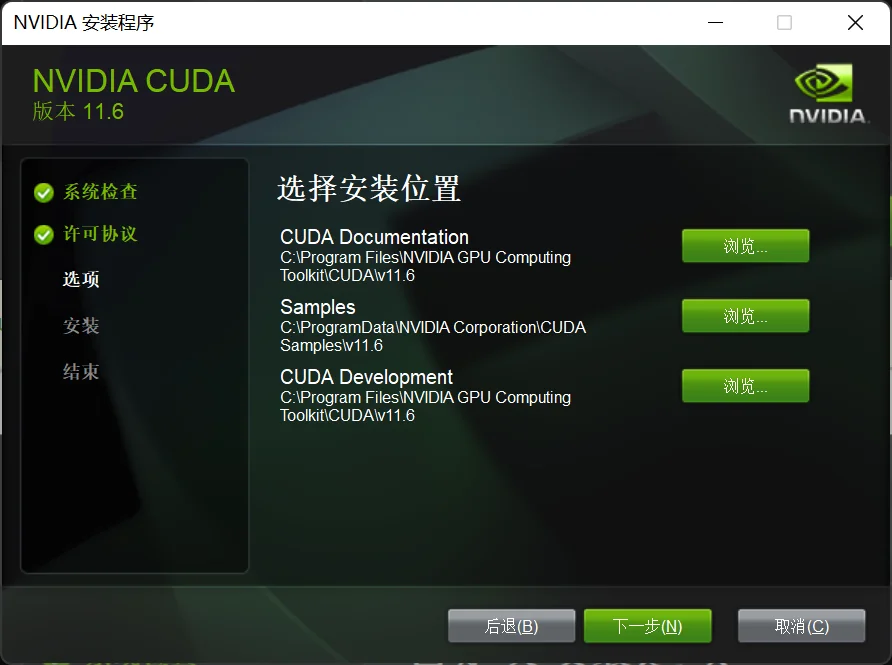 与普通软件安装不同,在安装 CUDA 时,需要设置两次。第一次要求设置临时解压目录,第二次才是设置安装目录,这里建议默认即可,也可以自定义。安装结束后,临时解压文件夹会自动删除。切记,使用两次设置的路径不能相同,否则安装后会找不到目录。同时,因为是系统级软件,所以最好全程使用默认的安装位置。