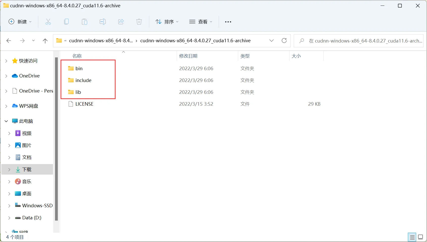 上面我们下载的内容实际上是压缩包文件,本质上就是对 CUDA 的关于深度学习的补充文件,我们需要将解压后的文件内容找到 CUDA Development 安装目录中对应目录,打开文件夹 逐一复制内部内容。需要注意的是: