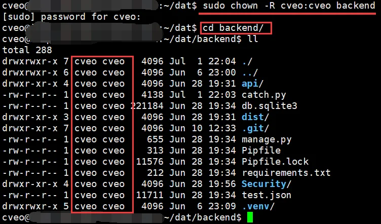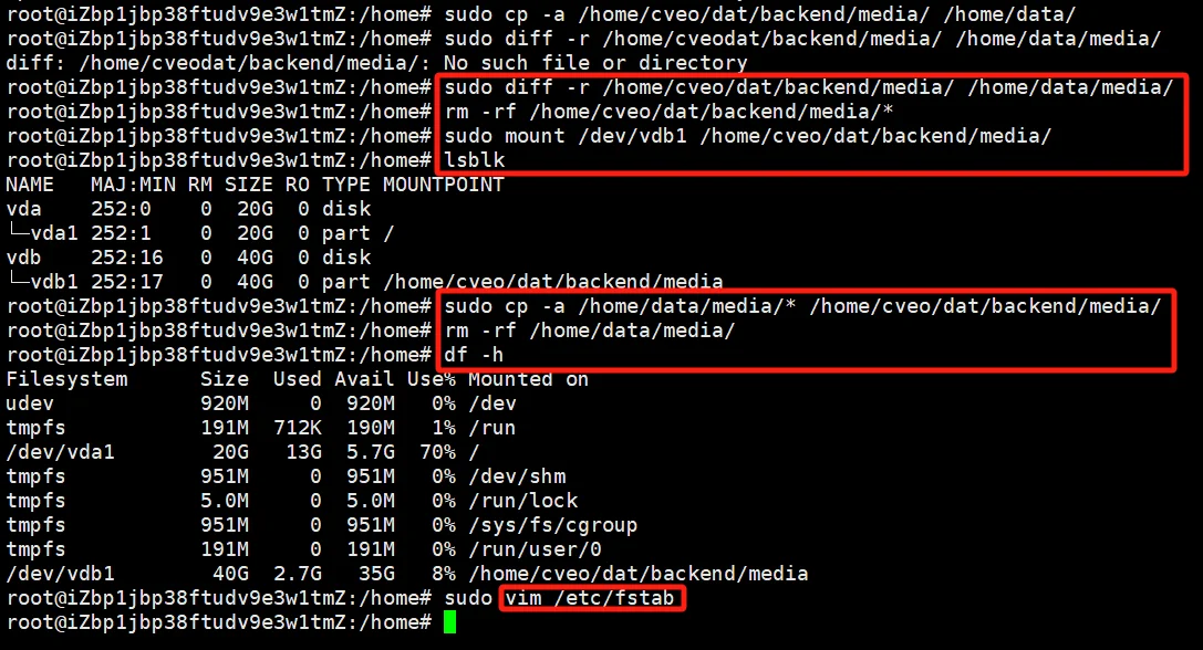 sudo mount /dev/vdb1 /home/cveo/dat/backend/media/