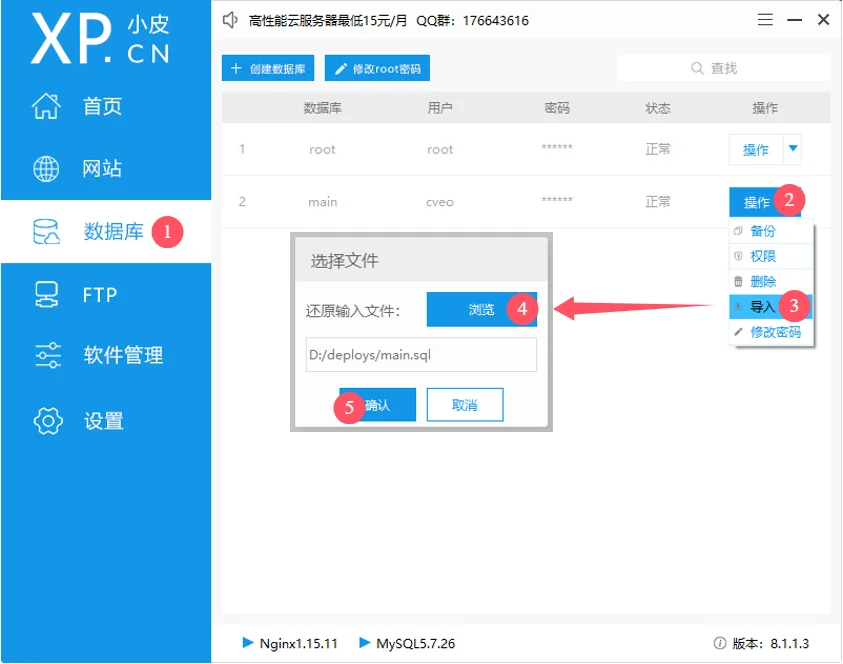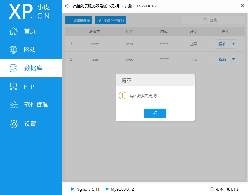 3、导入数据库,需要等待一会,成功会弹窗提示