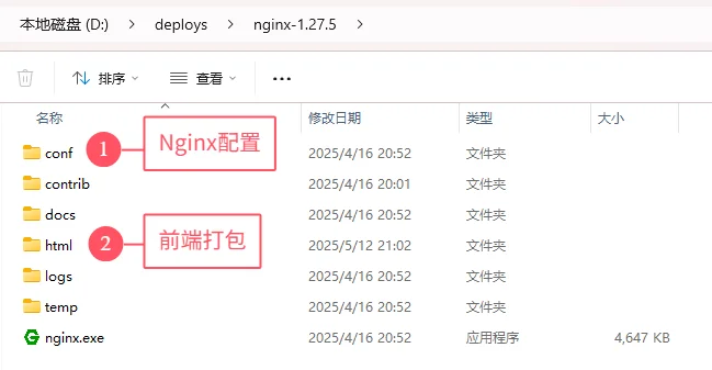 1、在开发电脑上打包好前端项目,将其拷贝到指定目录nginx-1.27.5\html\中。