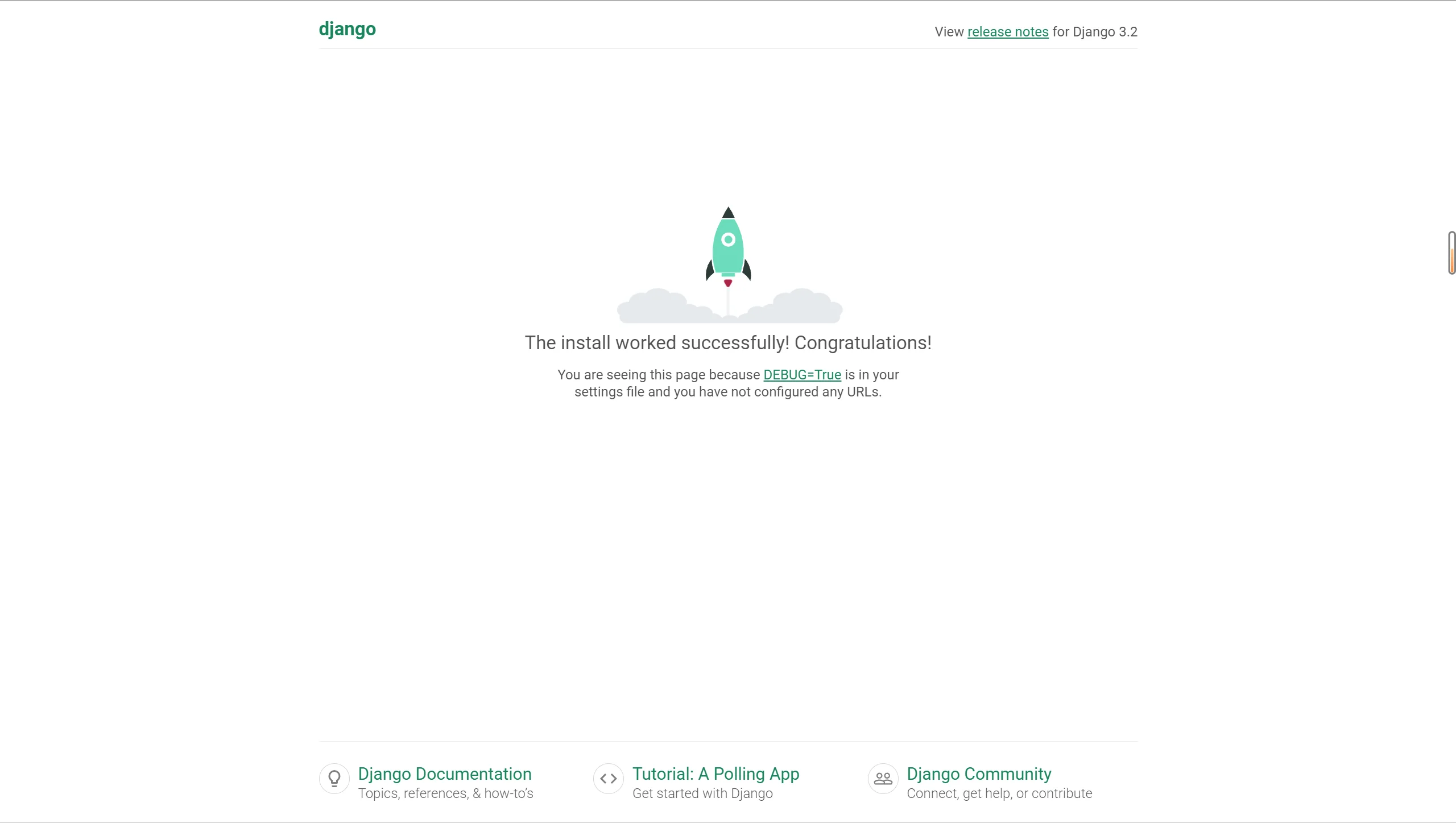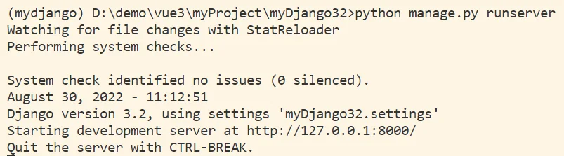 在每次使用 runserver 启动项目时,都会使用 StatReloader 监视文件更改并执行系统检查,系统检查没有发现任何问题才能正式启动项目。同时,还能够查看当前项目使用的 Django 版本以及使用的 settings 设置为 myDjango32.settings 。在 http://127.0.0.1:8000/ 上启动开发服务器,使用 CTRL-BREAK 退出服务器。