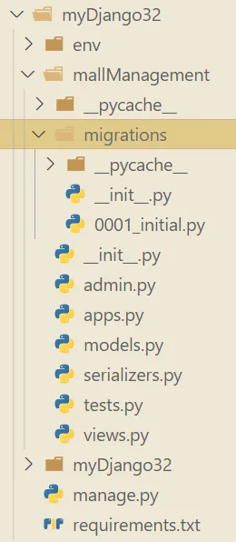 在执行后会产生 migrations 文件夹,其内的 0001_initial.py 即为接下来对数据库进行操作的代码。