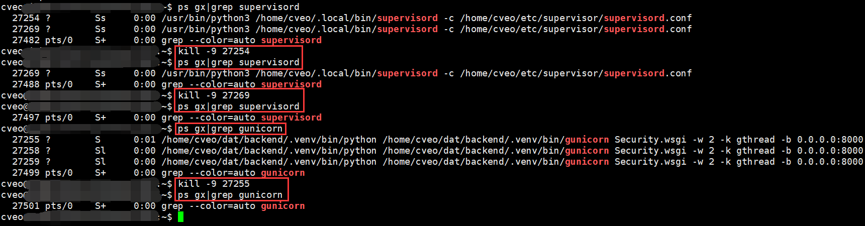 接下来,我们需要先查出 supervisord 和 gunicorn的进程序号,然后根据进程号逐个杀死,最后再次查看是否完全关闭。