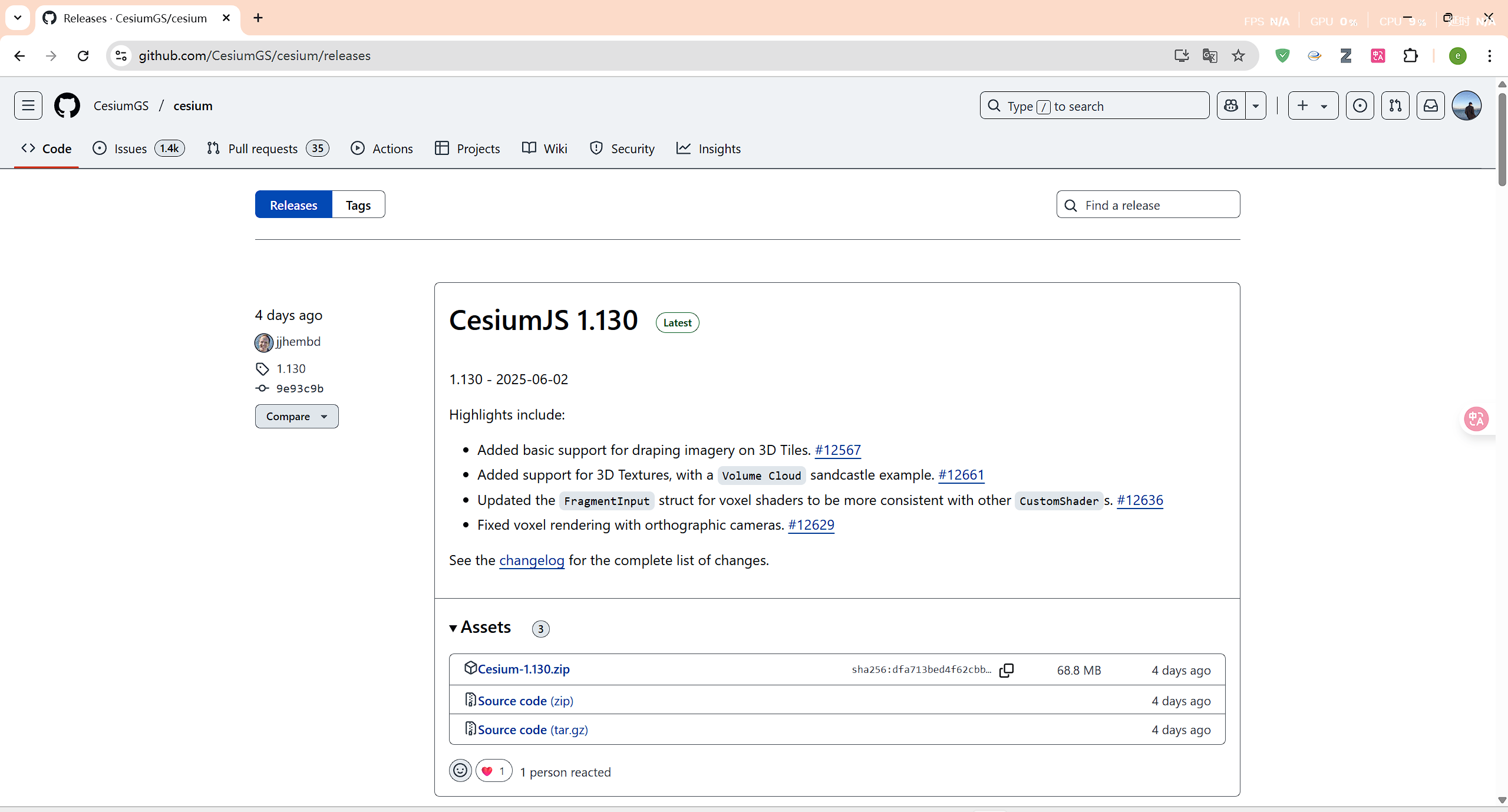 这里我们选择当前最新(截止至2025.6.7)的 CesiumJS 1.130 进行下载安装。